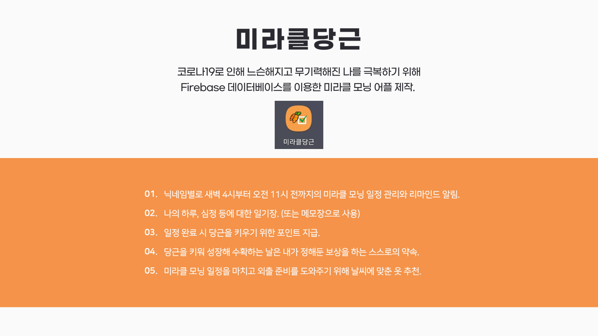 - 코로나19로 인해 느슨해지고 무기력해진 나를 극복하기 위한 미라클 모닝 어플 제작